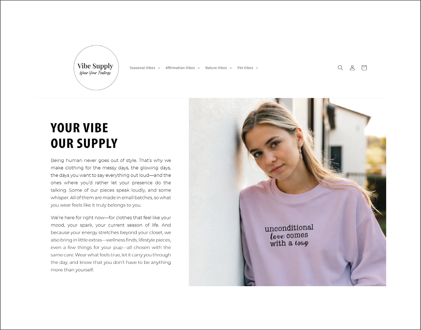 Vibe Supply is a fully built lifestyle brand that blends clean, modern branding with emotionally driven apparel. The project includes a cohesive visual identity, expressive t-shirt and hoodie designs, and a polished e-commerce site that feels both elevated and welcoming. Every element – from the typography to the photography to the product presentation – reinforces the brand’s “Wear Your Feelings” ethos. The result is a seamless, professional brand experience that looks premium and connects instantly with its audience.